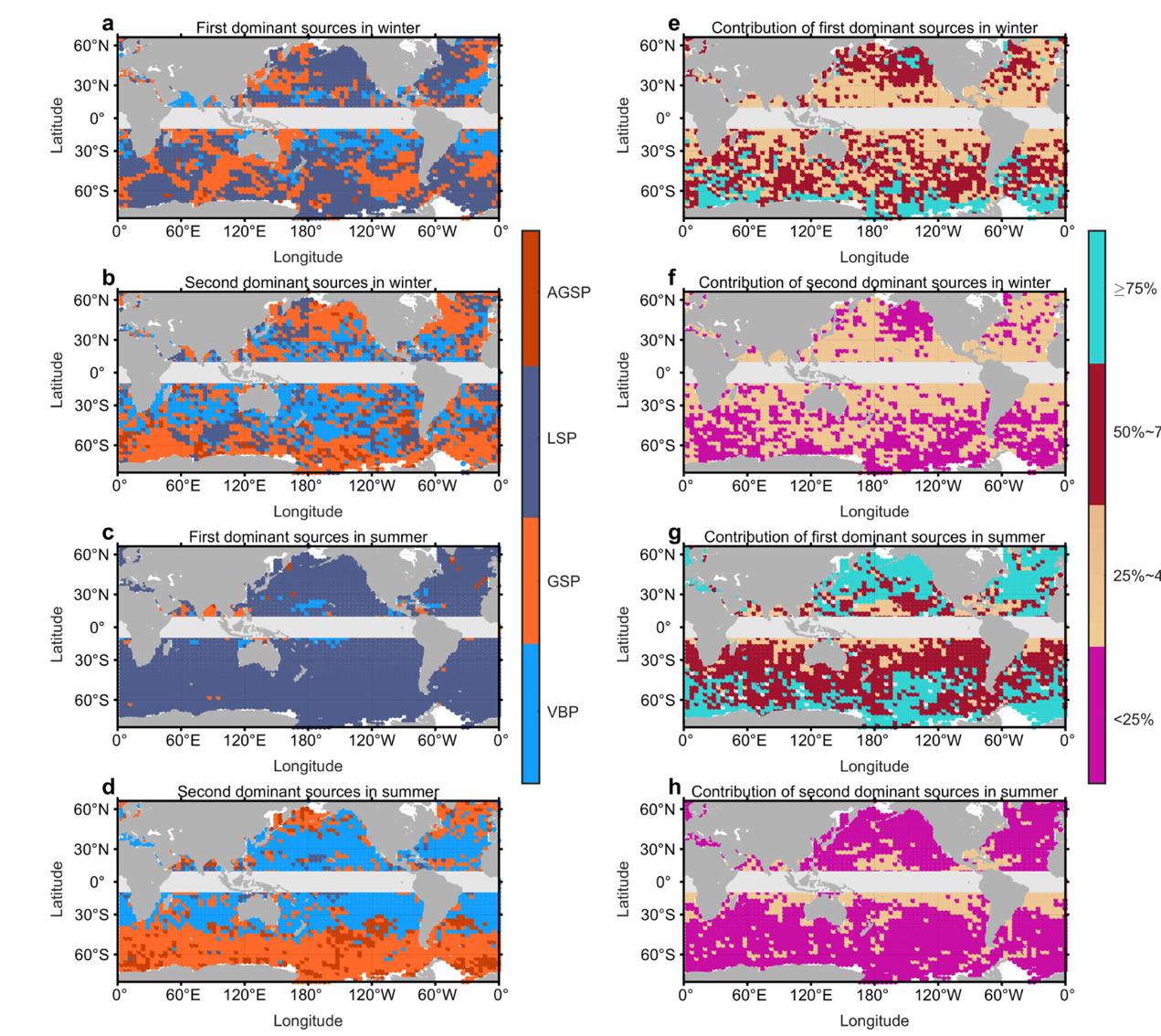 图2.不同季节主导上边界层湍耗散排名第一、第二的能量源及其占比:(a、b、e、f)冬季;(c、d、g、h)夏季