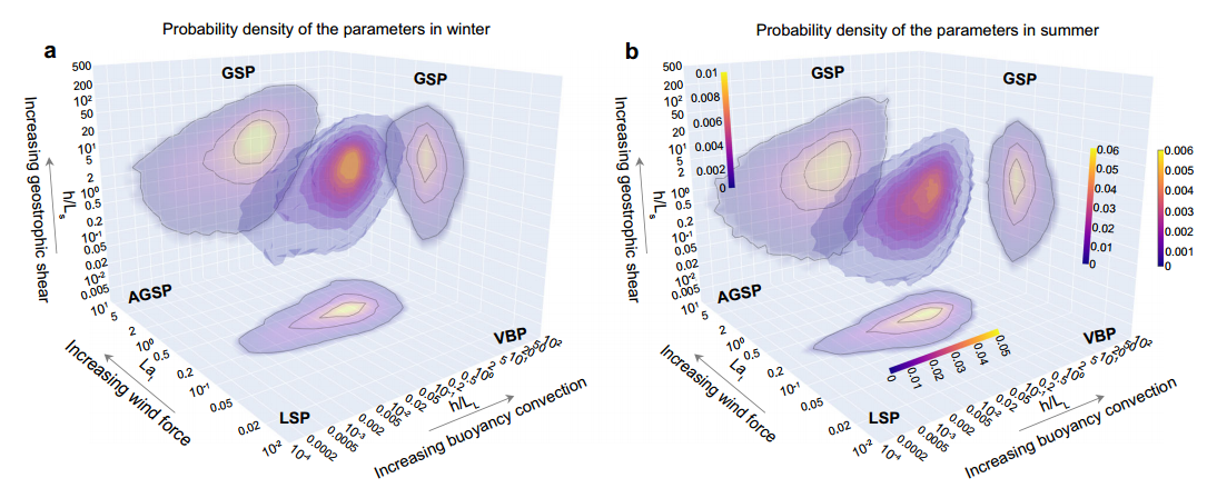 图1.决定亚中尺度过程(GSP)、朗缪尔环流(LSP)、非地转剪切(AGSP)和垂向对流(VBP)过程四类湍动能能量源的相对贡献大小的三个无量纲量,湍流朗缪尔数()、边界层深度与朗缪尔稳定尺度的比值(h/)以及边界层深度与地转剪切稳定尺度的比值(h/)的三维概率密度分布:(a)冬季;(b)夏季