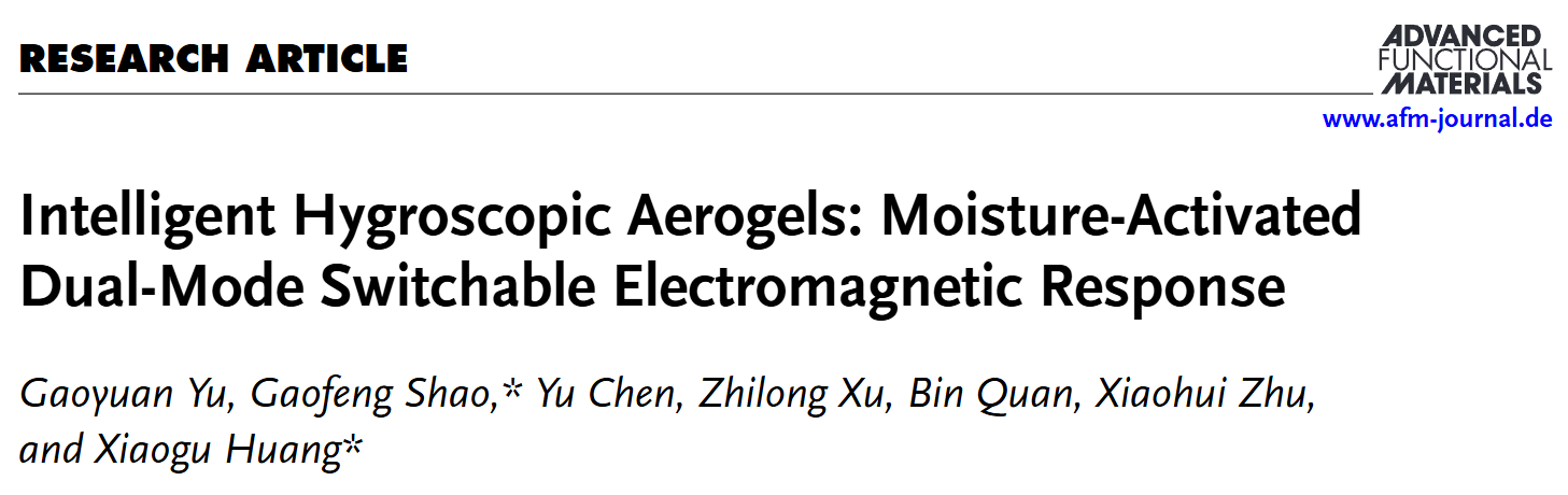 近日,化学与材料学院电磁功能材料研究团队在Advanced Functional Materials期刊发表题为“Intelligent Hygroscopic Aerogels: Moisture-Activated Dual-Mode Switchable Electromagnetic Response”的研究论文,论文第一作者为博士研究生于高远,通讯作者为邵高峰副教授和黄啸谷教授。