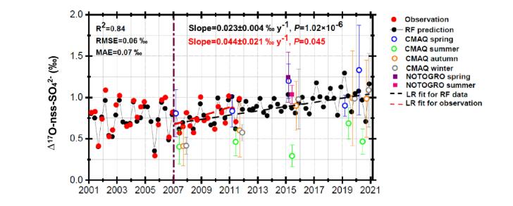 研究团队基于西北太平洋父岛观测站(代表东亚区域背景)长期获取的大气非海盐硫酸盐气溶胶氧同位素异常值(Δ¹⁷O-nss-SO₄²⁻),结合随机森林(RF)模型和空气质量预报及评估系统(CMAQ)模式模拟,深入解析了中国SO₂减排对东亚硫酸盐气溶胶生成机制及效率的影响,并解释了东亚大气硫酸盐浓度下降比例低于欧美地区的可能原因。