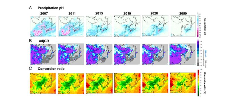 中国SO₂减排后,中国泰山和日本立山大气云水pH的观测值逐年增加。CMAQ模拟结果显示,东亚地区雨水的pH值和大气的adjGR(表征大气中剩余NH₃浓度的指标)在SO₂减排后也呈现上升趋势(图3A, 3B)。而东亚地区大气酸度的持续减小,有利于大气臭氧驱动(S(IV)+O₃)途径生成硫酸盐气溶胶,从而导致硫酸盐的生成效率增加(图3C),最终导致大气硫酸盐浓度的降幅低于SO₂的减排幅度。