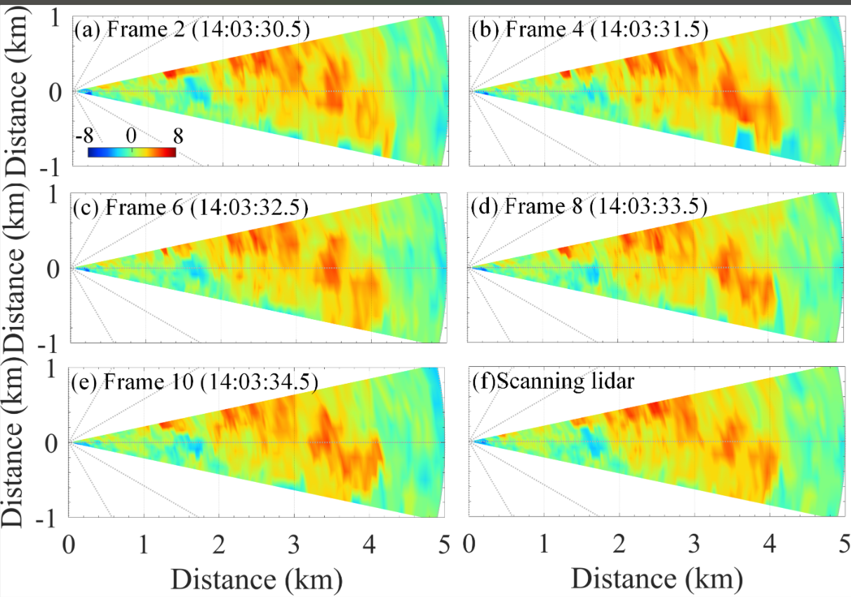 图1 (a-e) 瞬态风相机0.5 秒曝光时间拍摄的偶数帧风场,(f)传统扫描式激光雷达的风场