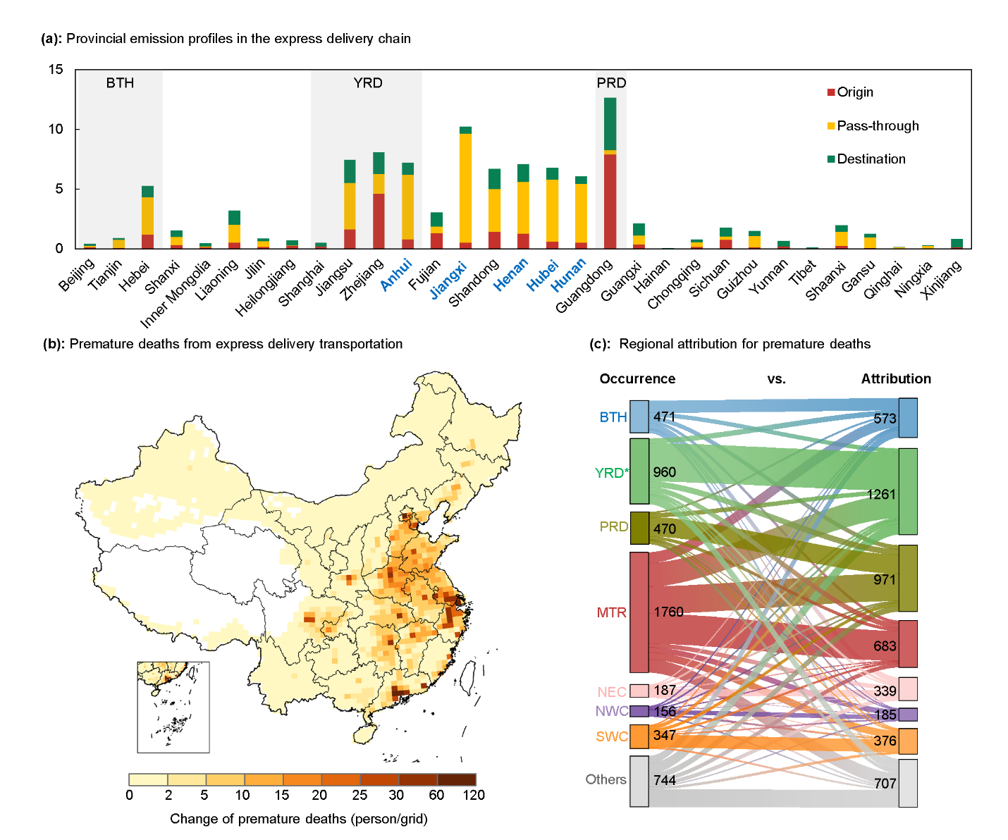 随着数字经济的快速发展,我国快递业呈现出爆发式增长,已占全球快递业务总量的近70%。然而目前对其运输过程的碳污排放格局及其健康负担认识仍然有限,特别是快递包裹的流动过程中会在其途径省份产生大量的排放和环境影响,造成环境负担从消费地区向途径省份转移,而这种跨区域的环境负担转移机制尚未得到科学量化。为此,研究团队基于海量的真实快递运单大数据,利用路径识别技术和大气化学传输模式,开发了我国快递运输业道路级别的高分辨率排放清单,首次实现了包裹运输过程中的高分辨率排放追踪,并揭示了快递部门的大气环境与健康效应。该研究揭示了数字经济时代城市便利性背后隐藏的环境代价及其跨区域不平等性,为促进区域环境公平和推进绿色可持续的物流发展提供了重要科学支撑。