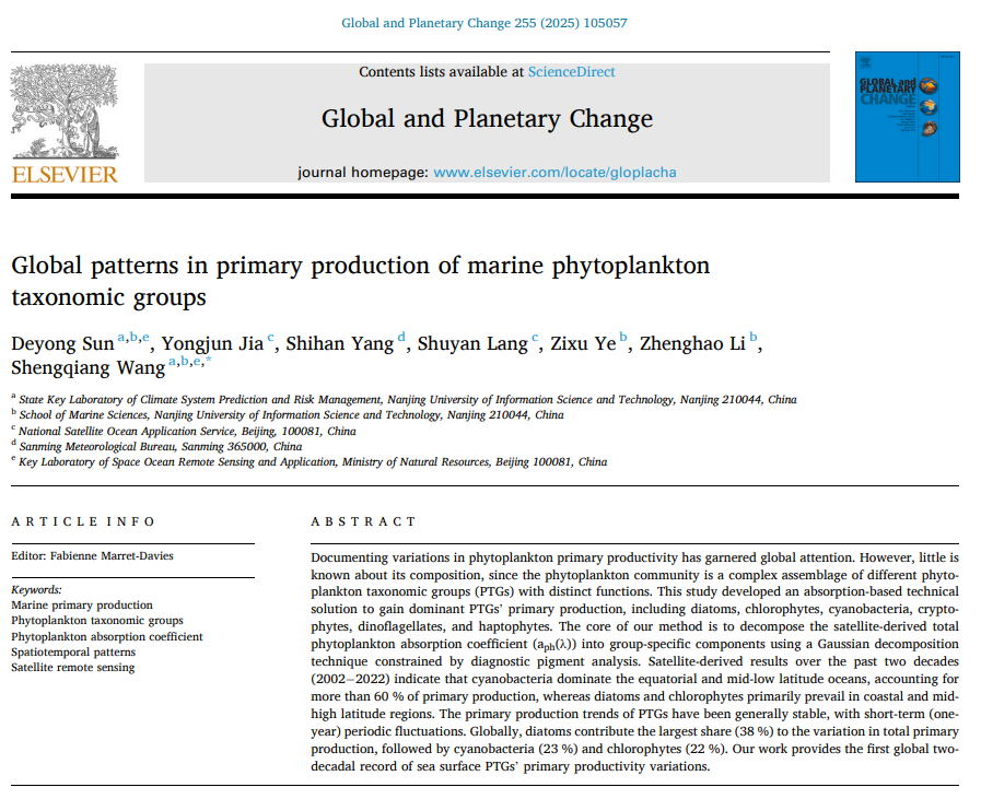 近日,伟德海洋遥感团队孙德勇教授课题组在海洋浮游植物类群初级生产力遥感领域取得新进展。研究成果以《Global patterns in primary production of marine phytoplankton taxonomic groups》为题发表于地球科学领域顶级期刊《Global and Planetary Change》(中科院一区Top)。第一作者为孙德勇教授,合作者包括伟德王胜强教授、国家卫星海洋应用中心贾永君研究员、2020级硕士研究生杨诗晗、国家卫星海洋应用中心郎姝燕副研究员、2025级博士研究生叶子绪和2021级博士研究生李正浩。伟德气候系统预测与变化应对全国重点实验室为第一单位。