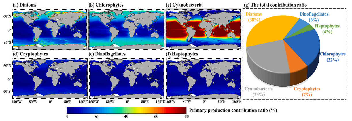图1.六大典型浮游植物类群初级生产力贡献率的全球空间分布格局