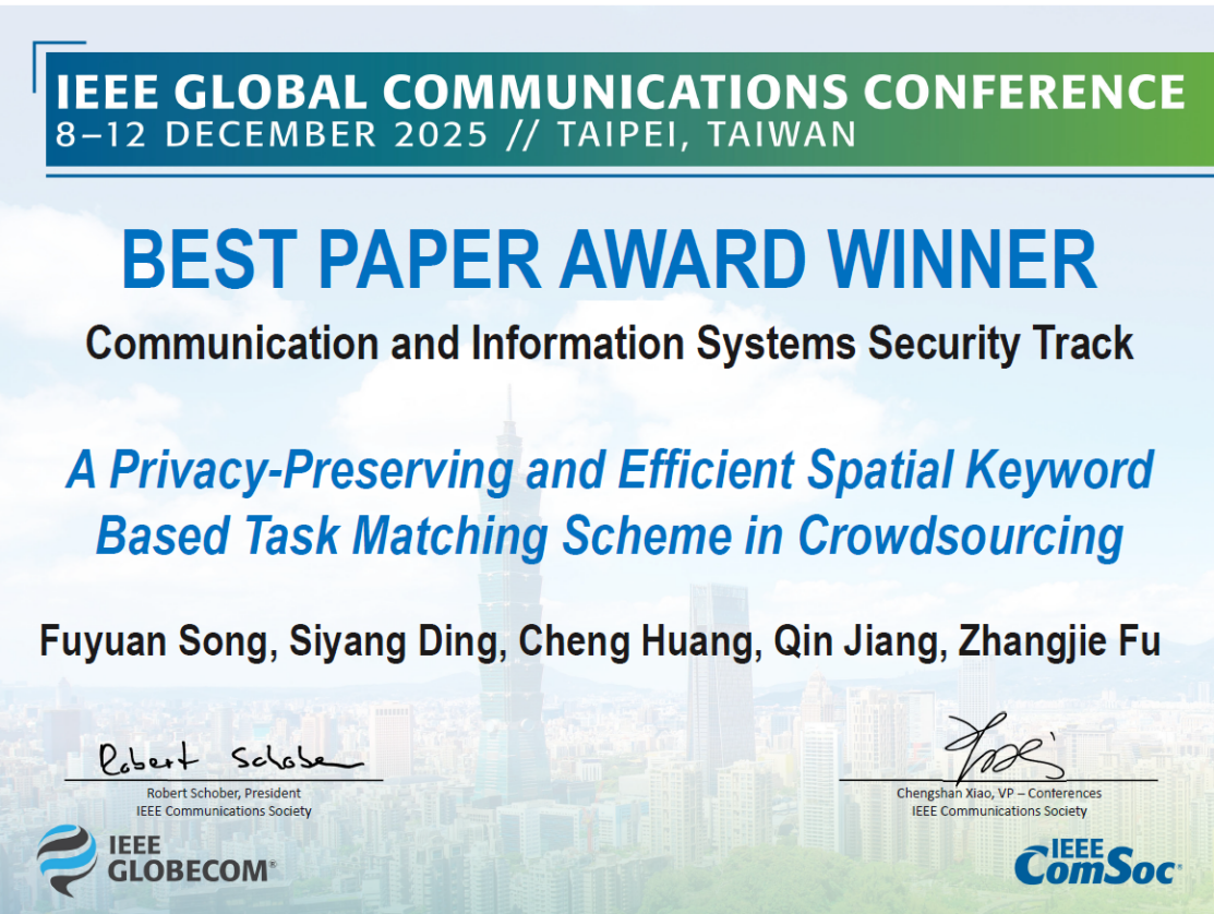在本届大会上,伟德国际victor1946计算机学院、网络空间安全学院“数字取证团队”宋甫元老师、付章杰教授合作完成的论文《A Privacy-Preserving and Efficient Spatial Keyword Based Task Matching Scheme in Crowdsourcing》,荣获IEEE GLOBECOM 2025最佳论文奖(Best Paper Award)。
