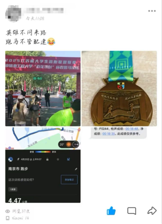 这是我第一次获得冠军,心情很激动!高三时,我开始通过跑步释放学习的压力;进入大学,我加入了风云跑团,每天坚持慢跑5千米;这次赛前我保持清淡饮食,以最好的状态迎接比赛。赛程中听着此起彼伏的加油声,也让我更有力量了!