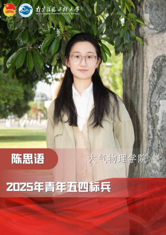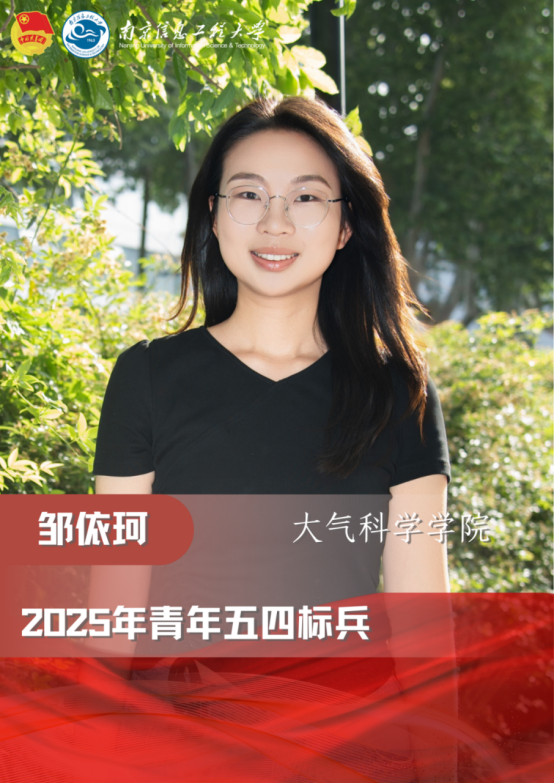 邹依珂,中共党员,大气科学学院2021级年级长、本科生第四党支部组织委员、班长。她青春向党,挺膺担当,积极参加党建、志愿及朋辈服务工作。她注重个人的专业成长,笃学不倦,精益求精,曾获2024年国家奖学金、2024年校长奖学金等多项荣誉。作为学生干部,她恪尽职守,满怀热忱,牵头策划年级活动、主题党日活动、班级活动30余项,始终坚守为同学们服务的初心,被评为2024年江苏省优秀学生干部。作为大气人,她追风逐梦,志在风云,主持一项国家级大创项目,参与一项省级大创项目,以第一作者身份撰写论文于北大核心期刊在线发表,获授权六项软件著作权,推免直博至中科院大气物理研究所,她渴望为中国气象在国际地位的提升贡献信大力量。