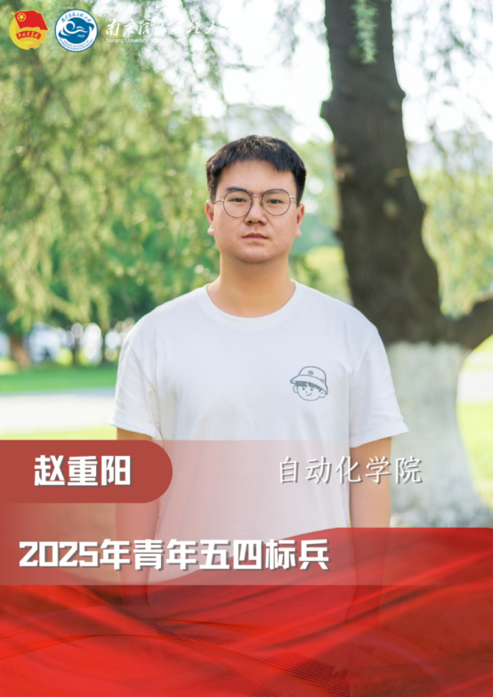 赵重阳,中共党员,自动化学院本科生第一党支部组织委员。他4个学期成绩位列第一,超70%课程达90分以上,曾获2023学年和2024学年国家奖学金,2023学年校长奖学金,并获评江苏省三好学生荣誉称号。他开拓进取,凭匠心雕琢技术,曾获全国大学生智能汽车竞赛全国总决赛二等奖等国家级奖项6项,省级奖项十数项,主持并结题省级大学生创新创业训练计划1项,以第一作者身份授权发明专利1项。作为学生干部,他搭建"传帮带"竞赛平台,助力班级成员斩获省级竞赛30余项。作为校内志愿者,他参与近百项志愿活动,累计志愿时长达160小时,获评校级“优秀青年志愿者”荣誉称号。
